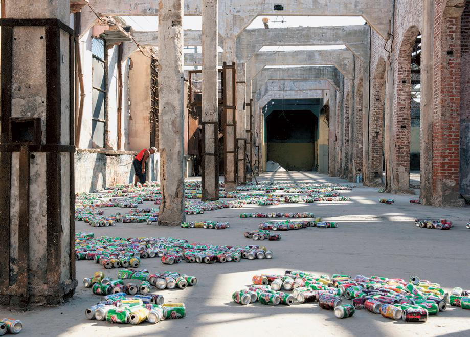 Gabriel Kuri, Aire, 2015. Latas de aluminio, parte de la exposición «Montañas con una esquina rota», Fábrica de bicicletas Pipián, Bienal de La Habana. Foto: Roberto Ruiz.